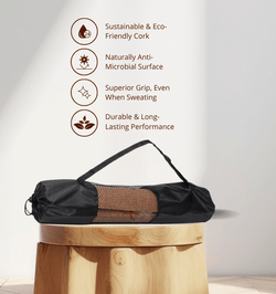 Sac de transport pour tapis de yoga en nylon noir et polyester avec filet ajouré, léger et respirant. Fermeture par cordon, idéal pour un usage quotidien.